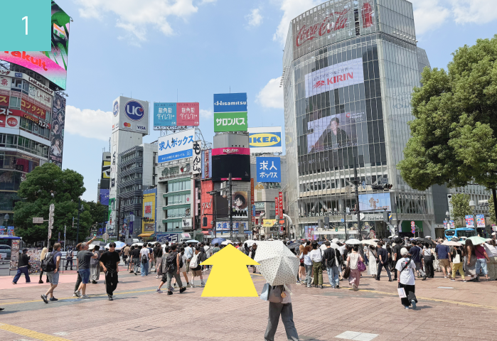 Cross the Scramble Crossing and walk toward SHIBUYA109.