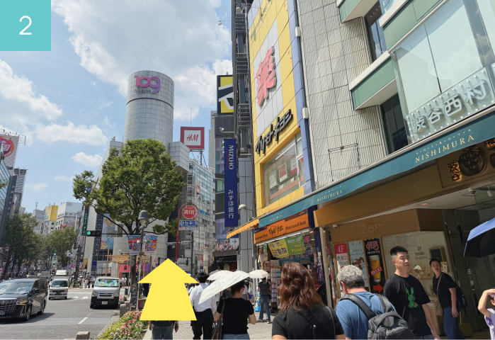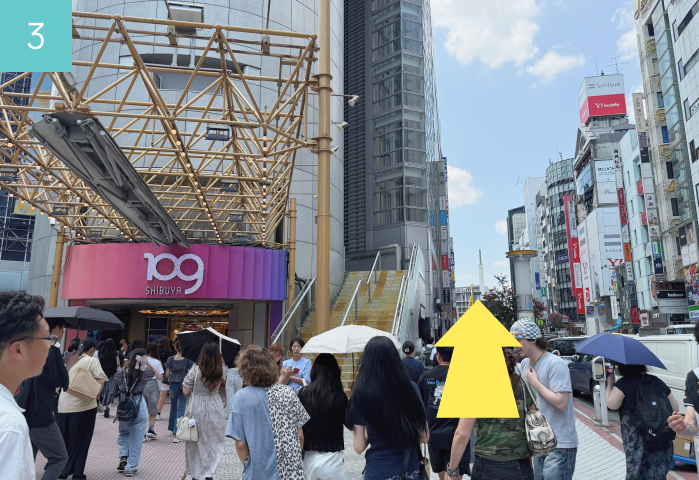 With SHIBUYA109 in front of you, take the street on the right side, which puts Shibuya 109 on your left and continue straight ahead.